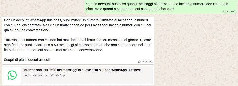 Risposte ottenute dalla chat dell'assistenza dell'app Whatsapp business